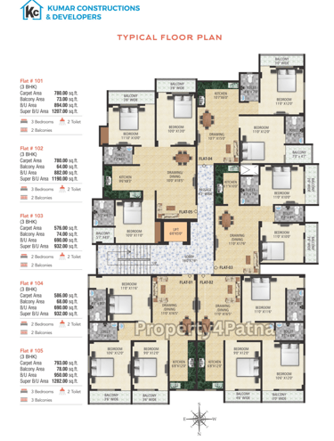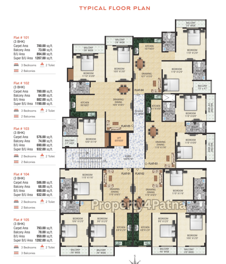 The project has a total of 20 flats in a G+4 tower, with 5 flats on each floor (3 units of 3 BHK and 2 units of 2 BHK per floor).