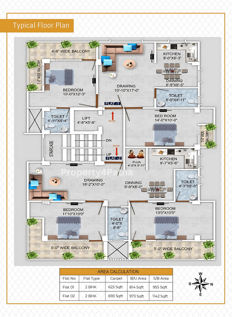 Super Built-up Area of 2 BHK Flat: 955 / 1142 Sqft.